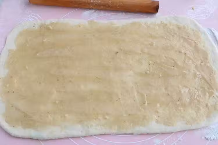5、從上面折1/3回來,再從下面折回去,用搟麵杖搟薄,再次折疊一次,這樣重復3次即可;