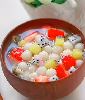 將切好丁的水果粒放入湯圓上,加入一勺甜湯,就成了清新爽口的美食圓子了。
