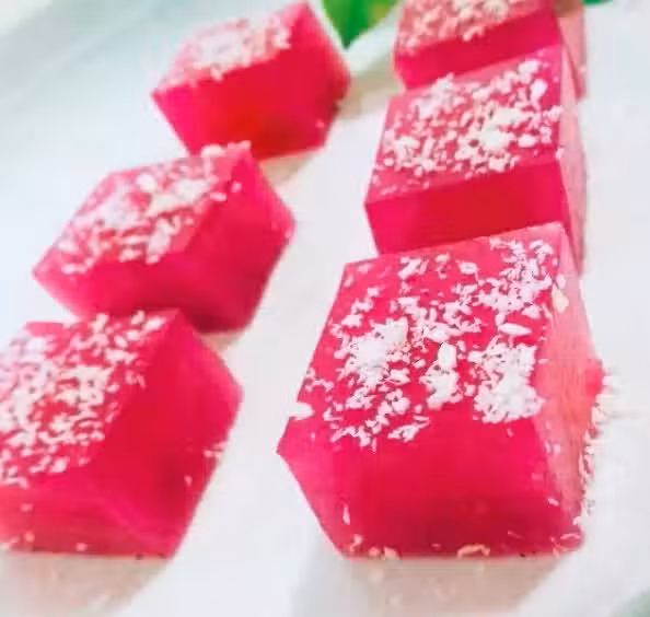 紅心火龍果1個,白糖30g,水150ml,吉利丁粉20g,椰蓉。