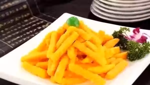 4、炒鍋注油燒至五成熱,將南瓜條逐條蘸勻蛋糊下入油內炸至金黃色,撈起控油。