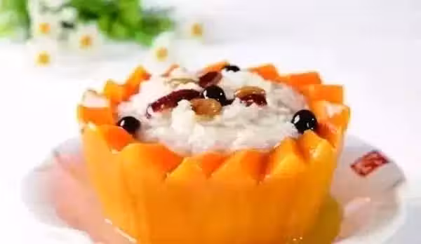 1、將老南瓜洗凈,在蒂部挖開去瓤,然後將糯米、果仁、豆沙、白糖、桂花等拌勻裝入瓜內,再將瓜蓋好固定,上籠屜蒸至米熟瓜爛即可。