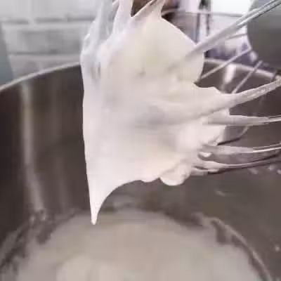 3、高速打發蛋白,隨時停下來檢查蛋白狀態,出現明顯紋路,轉低速整理蛋白,攪打至拉起打蛋籠,蛋白出現尖角即可