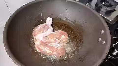 5.炒鍋燒熱淋入少許食用油,開小火加入兩勺白糖,小火慢慢把白糖炒至融化,炒成焦糖色下入雞腿煎一下,雞腿的兩面各煎2分鐘,煎至表面焦黃一些。