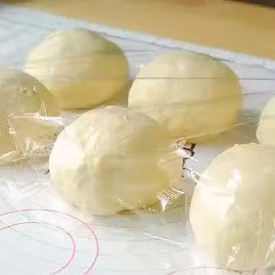 6、按壓排氣,分割成大小相等的6個劑子,蓋上保鮮膜鬆弛10分鐘。不經過鬆弛的麵團是很難擀開的。