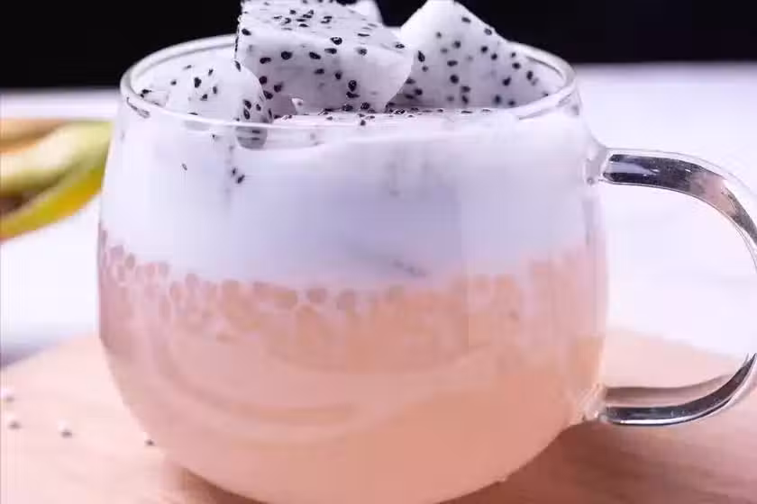 4、準備適量的牛奶或者椰汁,然後往其中加上適量的白糖,將其徹底攪拌均勻,倒在煮熟的西米中就可以了。最後可以加上桃子、芒果等自己喜歡的水果,這樣一份西米露就做好了。
