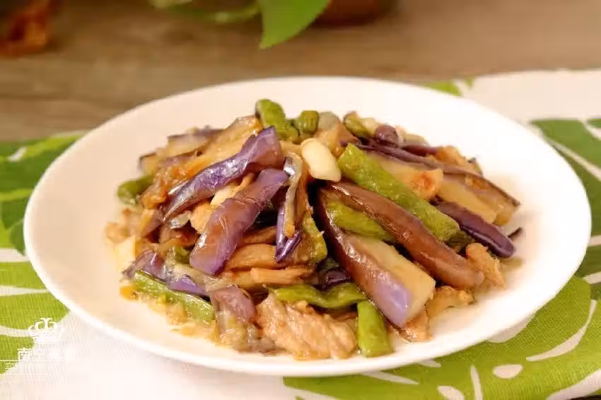 1、把茄子切成條狀,四季豆切段,瘦肉切塊後放入生粉醃制使其鮮嫩,蒜米切成粒