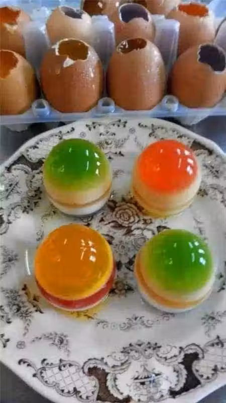 5. 一層顏色一層椰漿倒進雞蛋殼裡記得等待凝固後才倒第二層。