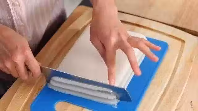 倒扣在案板上,就可以成功脫模啦。盒子有點呈梯形,所以把四周切一下找齊邊緣,如果是直上直下的盒子就不用了