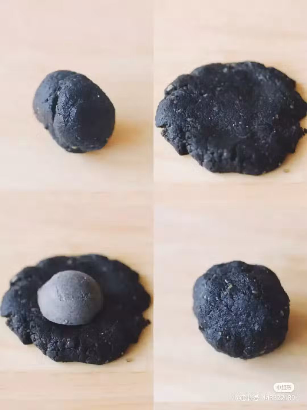 2]豬油加入牛奶,攪拌均勻,豬油慢慢軟化。奶粉、黑芝麻粉、低筋麵粉、糖粉混合過篩加入,攪拌均勻。揉成柔軟有捏合性的餅皮。餅皮蓋保鮮膜入冰箱冷藏2小時,分割餅皮20g每個。