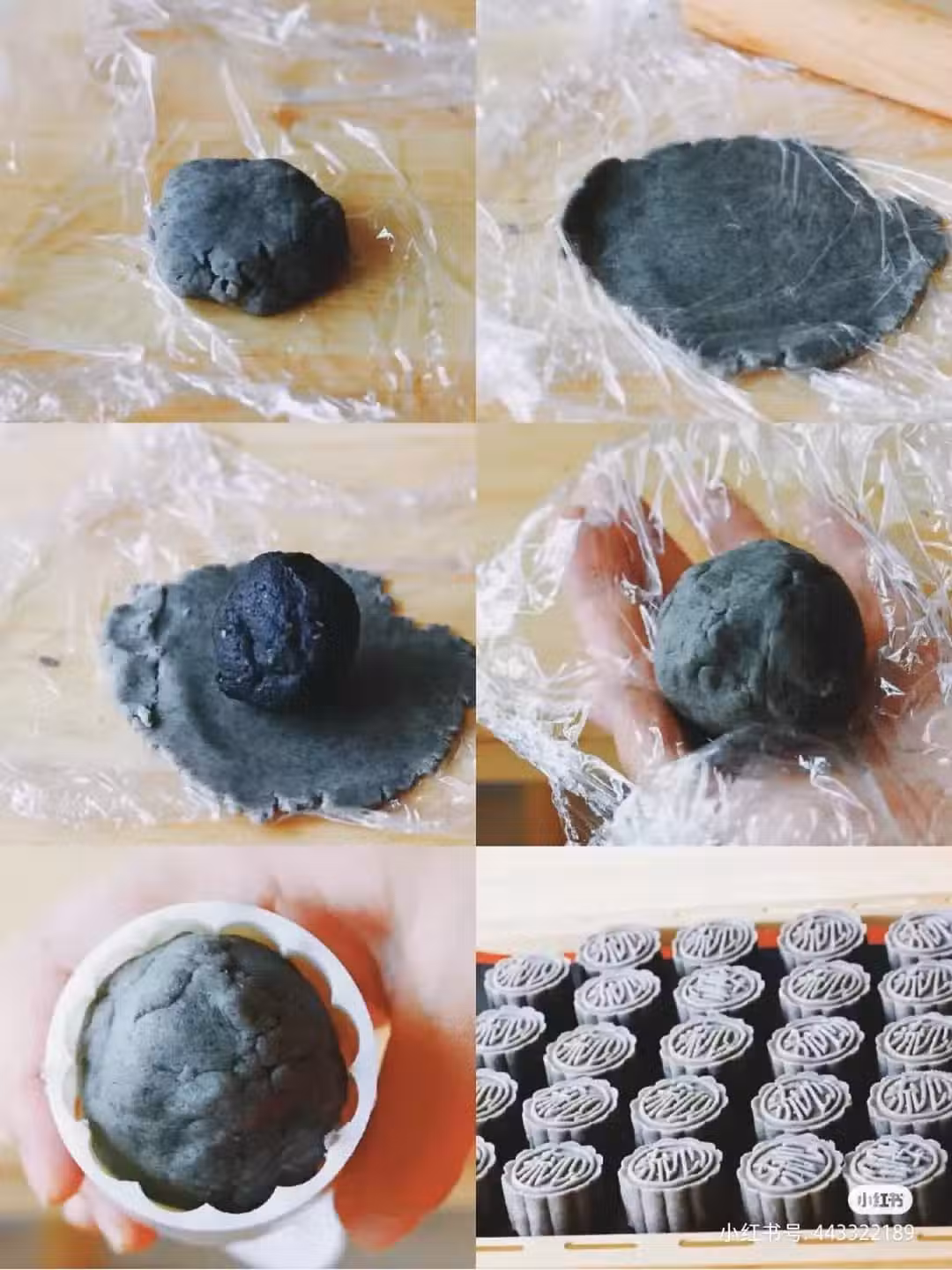 ✨如果感覺黑芝麻餅皮比一般廣式月餅餅皮干,不太好操作的寶寶,可以在桌上墊兩張保鮮膜擀皮,這樣可以擀薄擀得勻稱,又不會輕易破掉,方便包裹。