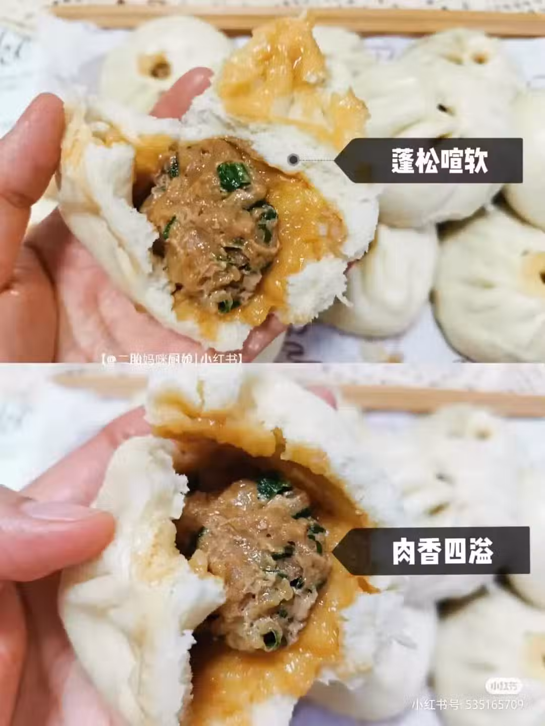 4]醒發好的麵糰揉搓排氣,分成小劑子,擀成邊薄中間厚的包子皮,放入肉餡收口捏緊,冷水上蒸鍋蒸15分鐘,關火燜2分鐘。趁熱開吃吧