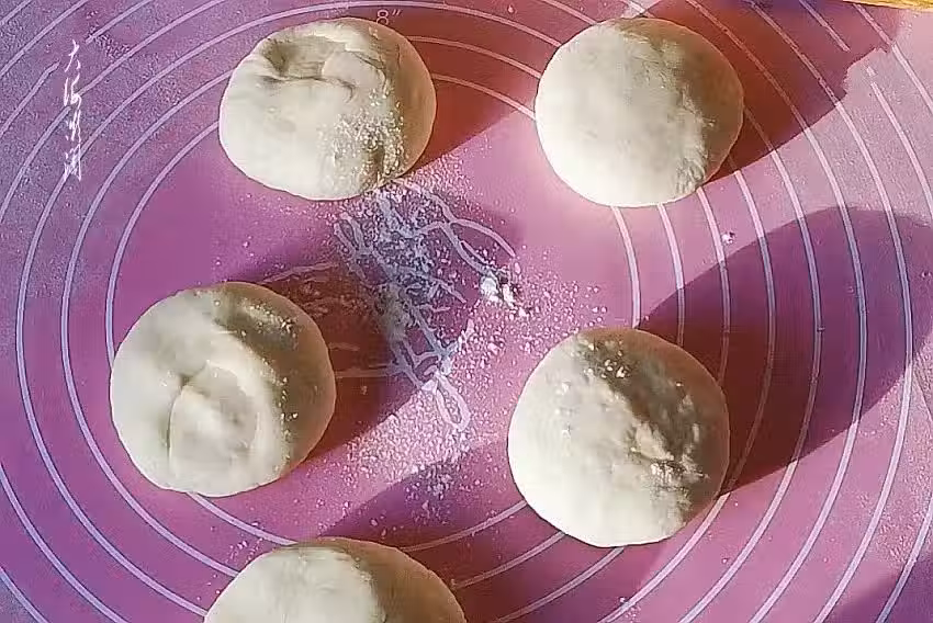 4 / 每個面劑子擀成餅,包上白砂糖,糖放多少隨自己喜歡的口味,再兌點麵粉,避免吃的時候流淌出糖汁燙傷。像包包子一樣收口捏緊,按平成小圓餅。
