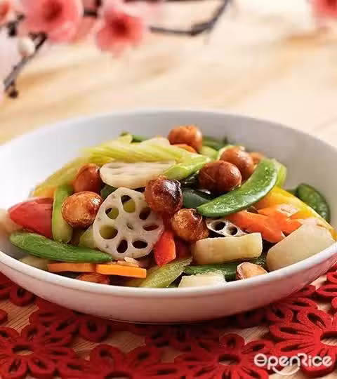 2. Heat 1 1/2 tbsp oil in wok, add in all ingredients togetherwith seasoning, stir-fry for about 2 minutes, dish out, top withmacadamia nuts.