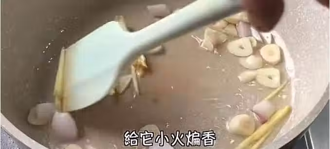 鍋中加入適量食用油,然後下薑,蒜,紅蔥頭,慢慢煸炒