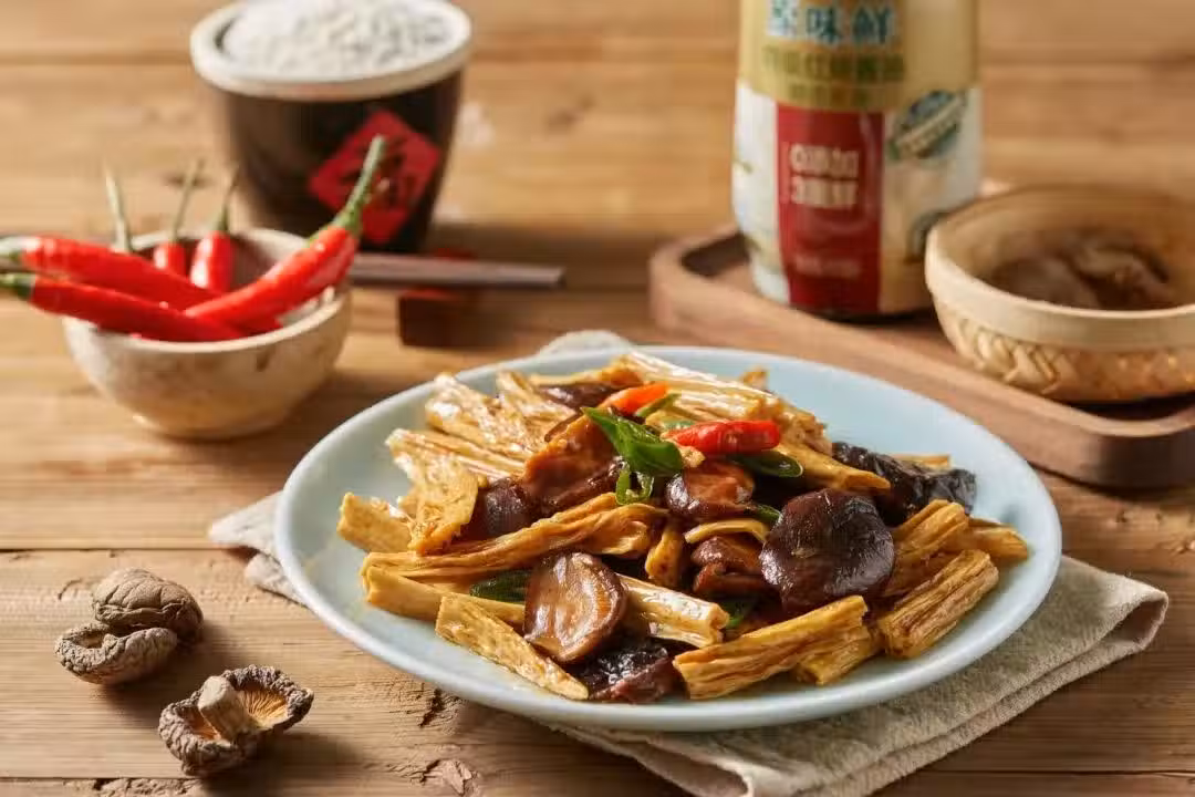 1. 腐竹和香菇預先泡發,把泡發好的腐竹切寸段;
