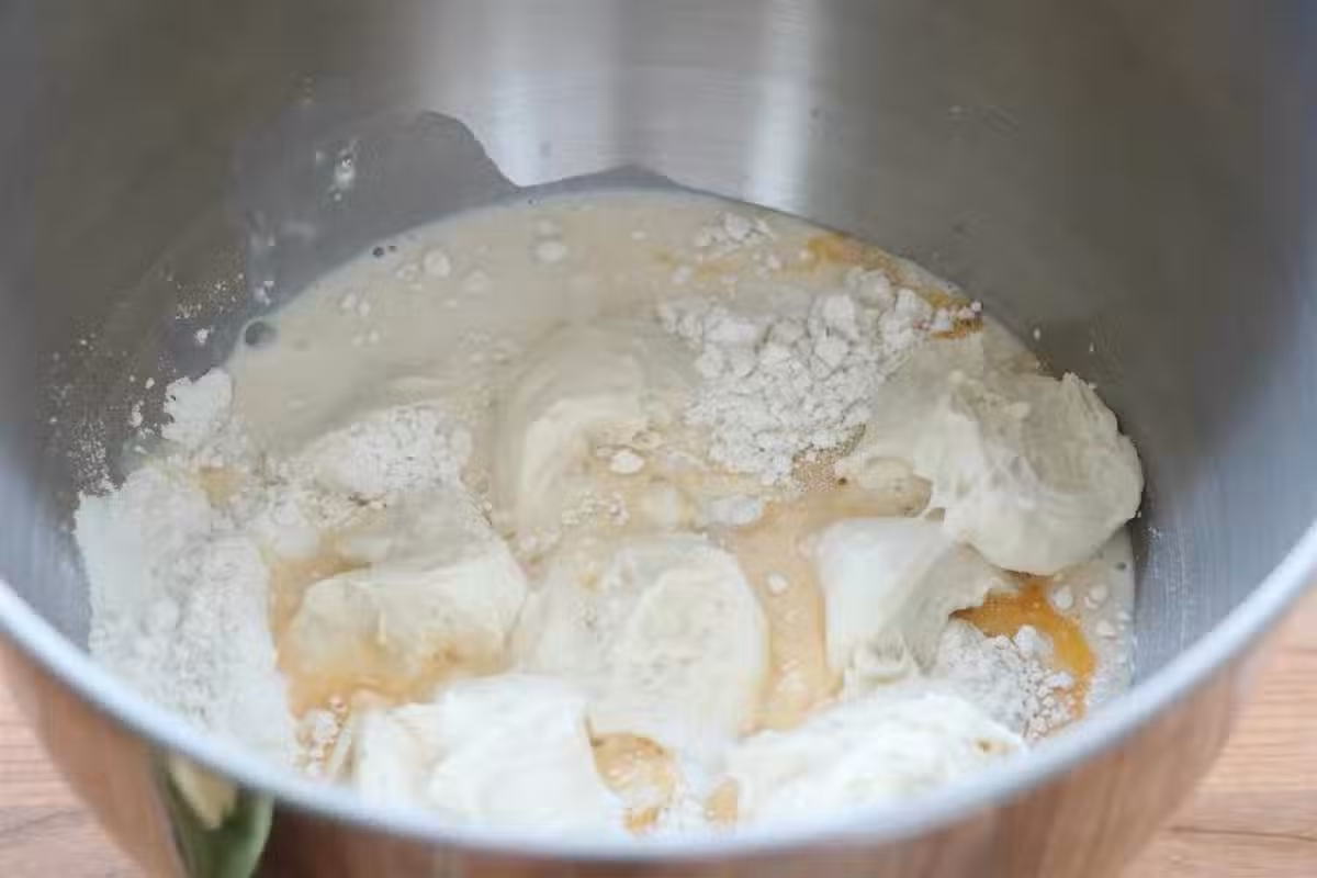 3、先開低速揉成團之後,再轉中速揉成光滑的面團,然後停下來檢查面團,能拉出厚膜就可以,加入提前軟化的黃油,繼續揉面。先低速再轉高速,揉出薄而不易破的膜就可以。
