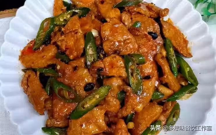 3鍋留底油,炒香蒜末,放入辣椒翻炒斷生,倒入肉片,加入1勺生抽、1勺蚝油、1勺老乾媽豆豉,翻炒均勻即可