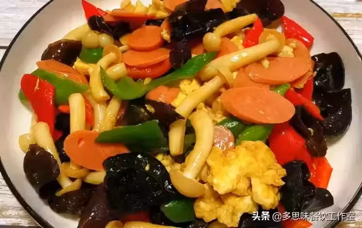 3鍋中熱油,倒入蔥蒜、青紅椒炒出香味,接著下入白玉菇、木耳、雞蛋、火腿腸翻炒均勻,然後加一勺生抽一勺蚝油,翻炒均勻即可出鍋啦