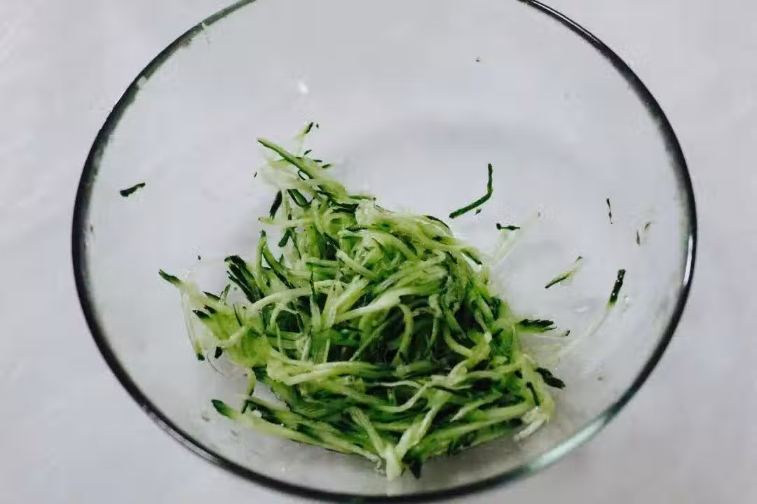 將黃瓜、胡蘿蔔分別洗凈,去皮擦絲後混合搭配容器裡;