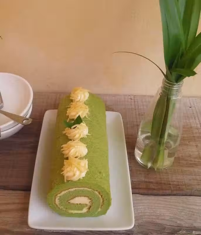 食材:班蘭葉6片、雞蛋3個、底筋麵粉60g、白糖80g、玉米粉10g、沙拉油20g;瑞士卷內陷:鮮奶油100g、香草精1.5g、糖10g