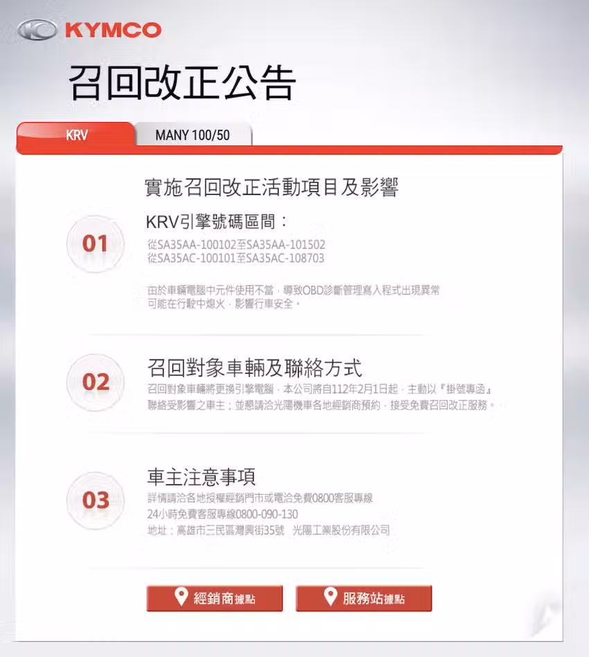 公告中並未告知受影響的 KRV 數量,不過有公布受影響的 KRV 引擎號碼區間。光陽將針對召回車輛更換引擎電腦方式處理,至於更換時間需要多久,光陽也未透露。