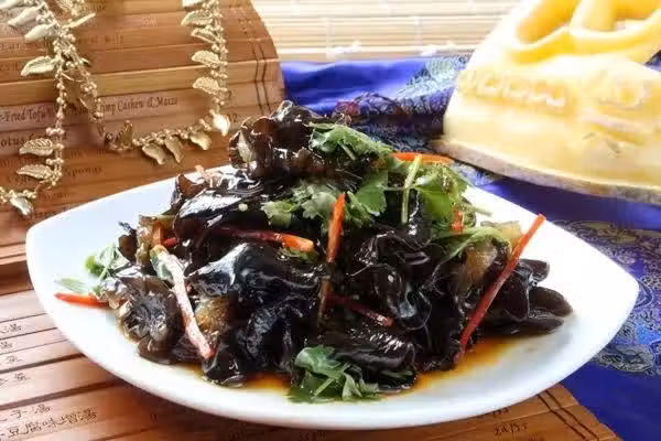 1、選好的東北木耳用涼水泡開洗凈 再用涼開水清洗一遍 然後焯一下;香菜洗凈切段;