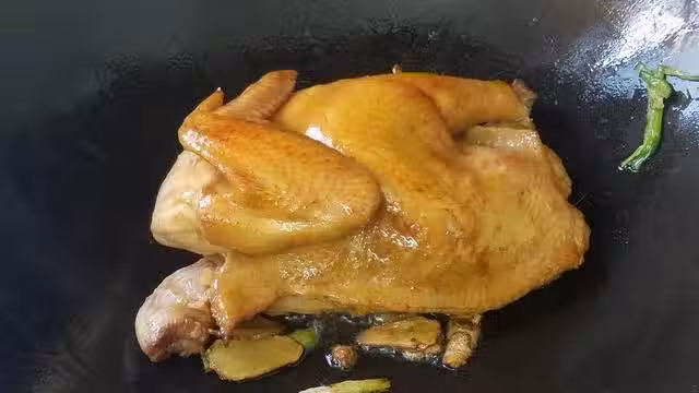 3.雞肉煎好後,把雞拿出來裝在盤子裡稍微放涼一下,然後倒入適量的鹽焗雞粉跟胡椒粉,把它們充分的塗抹在雞身上,稍微靜置10分鐘。