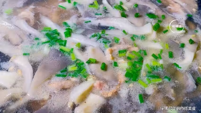 第四步:將肉絲放入到鍋中,等鍋中煮沸後即可關火,最後撒上少許的蔥花即可起鍋食用。每天早上喝一碗平菇肉絲鮮湯,對身體特別好!