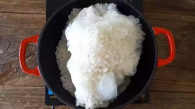 5.其餘的粗鹽蓋在雞上面,蓋上鍋蓋,開中小火煮,大概10分鐘左右調成最小火,慢慢焗一個小時。(期間會聽到噼里啪啦的聲音,這是正常的雞在出水,蒸氣和熱鹽混合)。