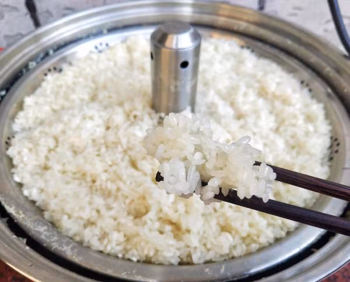 4、 把糯米蒸熟了以後,裝進一個比較大一點的容器裡面,取出來以後攤開讓糯米自然的晾涼到溫熱。溫度千萬不要注意太高了,就跟手術差不多,要是做出來的糯米溫度太高的話,米酒就很容易會出現發酸的情況。