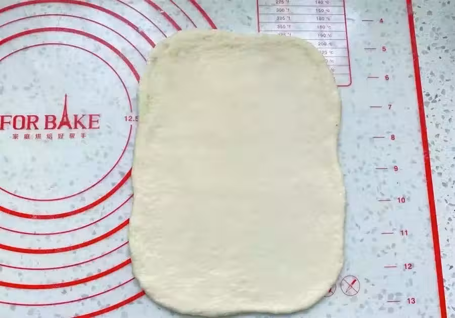 10、把麵團翻面,壓薄底邊,從上往下捲起,捲成長條形的面卷。