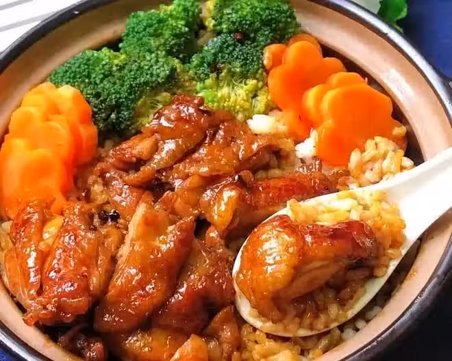 蔬菜焯水煮熟撈起,熱火放油放入大蒜爆香,放入雞腿中小火煎至兩面金黃,加入調好的醬汁,蓋好蓋子中小火燜十分鐘左右熟透即可