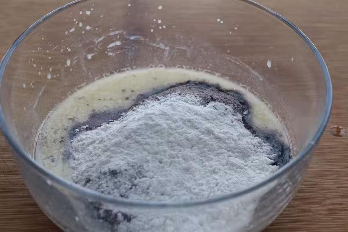 5、再加入2個蛋黃,拌均勻成流動的麵糊狀態;
