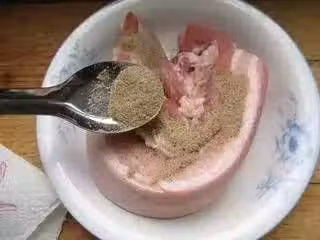 6. 將炒好的醃料倒在五花肉上。