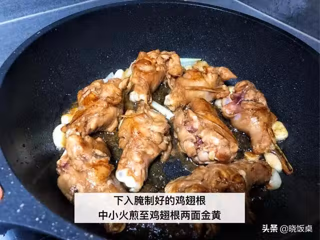 7、蔥姜蒜爆香後下入腌制好的雞翅根,然後調中小火煎制兩面金黃。