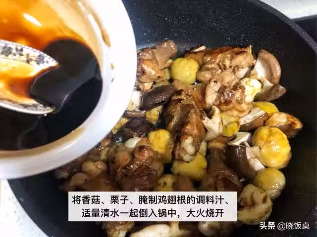 8、雞翅根煎制兩面金黃後把香菇、栗子以及剛才腌雞翅根的料汁倒入鍋內,然後再在鍋中加適量清水,調大火燒開。