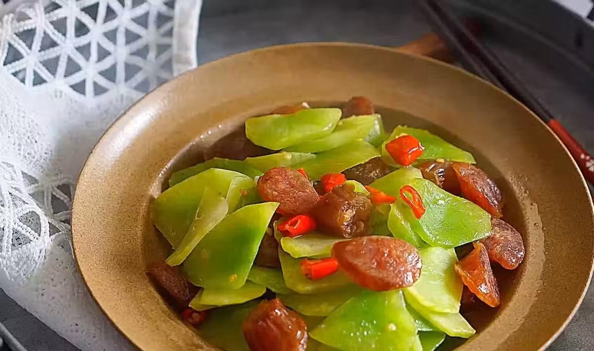4、再倒入萵筍快速翻炒即可關火出鍋,不用另外放鹽,臘腸里已含有鹹味。