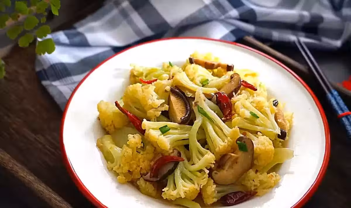 【食材準備】花菜350克、香菇3個、蔥1棵、紅辣椒3個、花椒1小把、鹽1茶匙、雞精少許