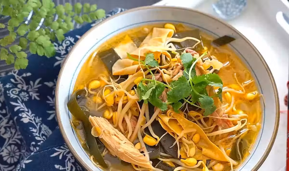 【食材準備】雞胸肉400克、黃豆芽180克、腐竹30克、海帶80克、鹽適量、蔥2棵、生薑4片