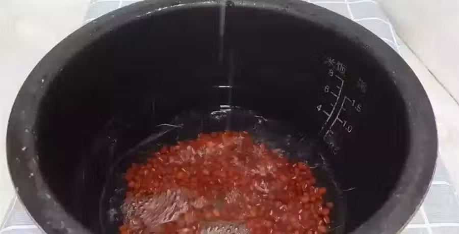 紅豆蒸半小時以後,煮至紅豆充分吸水,加入30克白糖,繼續蒸熟吸水。