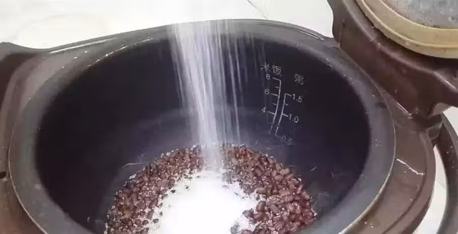 電鍋選擇蒸米按鍵就可,紅豆攪拌以後,可以搗碎成泥。