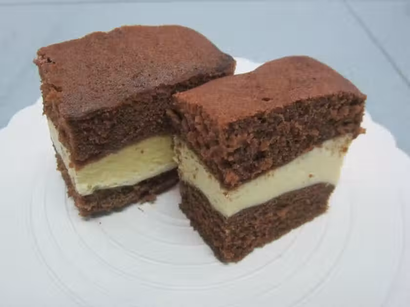 【將雞蛋和幼糖打至膨脹濃稠。加入vanilla香精,熱水,牛奶和食油輕輕拌勻。再加入過篩粉類拌勻,分成兩份。】