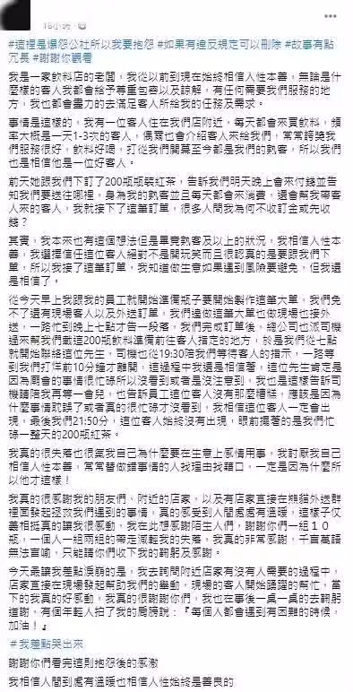 原PO接著說,在等待的過程中仍相信對方可能因為忙碌,才一時沒注意到訊息,便告訴司機再等待一下,也告訴員工這位客人沒有那麼糟糕,應該是因為被事情耽誤了或真的太忙才未能準時現身,「我相信這位客人一定會出現」,但直到晚間9點50分,對方依舊沒有出現,眼見一行人忙碌整天的200瓶紅茶就擺在前方,讓他感到相當失落,忍不住自責「為什麼要在生意上感情用事?討厭自己相信人性本善,常常替做錯事情的人找理由找藉口,一定是因為什麼所以他才這樣!」