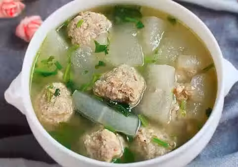 冬瓜 200克、豬肉餡 300克、生抽 4茶匙、豆腐 50克、藕 50克、蔥 1小段、雞汁 2勺、水澱粉 4茶匙、食鹽 1茶匙、雞蛋 1個、植物油 2湯匙、香菜 2根、姜 1小塊、黑胡椒粉 1/2茶匙、水。