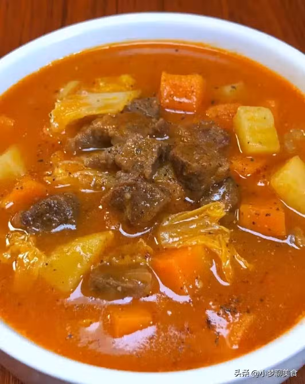 做法:牛肉切小塊,番茄去皮切小塊,把土豆、胡蘿蔔、紫洋蔥切丁,娃娃切斷備用,鍋里放入黃油,爆香洋蔥丁,倒入牛肉翻炒變色,再放入番茄大火炒出湯汁,加入適量清水煮開,接著放入蘿蔔丁和土豆丁,蓋上鍋蓋煮10分鐘,放入娃娃菜再煮5分鐘,出鍋前加入適量鹽和少許胡椒粉。