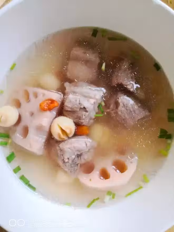 用料 :排骨300克、藕1節、蓮子十五粒、姜5片、蔥碎少許、枸杞10粒