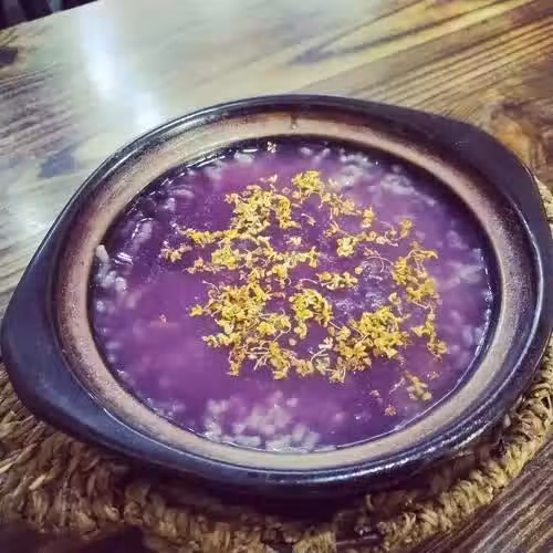 2、鍋中一次放足量的清水,加入泡好的大米和紫薯,大火煮開後轉中小火煮至大米粘稠即可,中途要經常攪拌一下,紫薯很容易煮爛,等大米粘稠時紫薯都已化到鍋裡面了,喝時放適量的桂花;