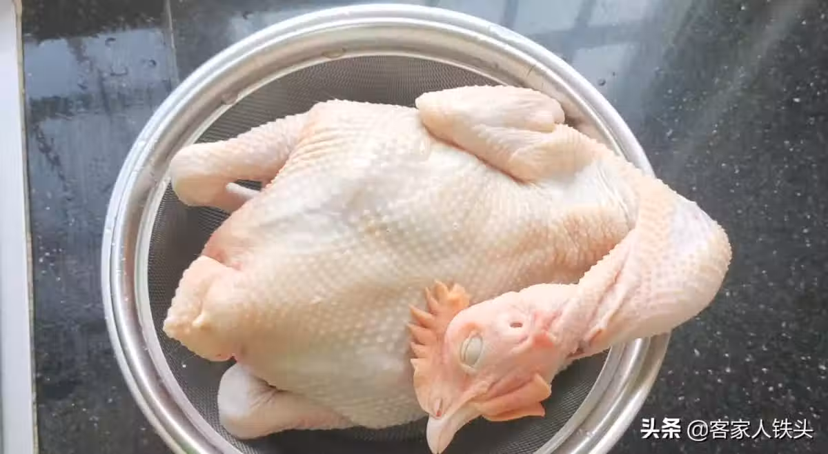 第一步:先準備一隻農家散養的雞,把雞處理乾淨,去掉雞脖子上的肥油和淋巴,雞屁股在這一步不要去掉,不管是蒸還是煮,雞儘量要保持完整,這樣做出來雞肉的口感才可以更好,處理乾淨的雞放在瀝籃子中稍微給它瀝干水分,然後準備一個大盤子,把稍微瀝干水分的雞放進去,加入一小勺的鹽,用手給它塗抹均勻,鹽不用太多,給它添一點底味就可以了。