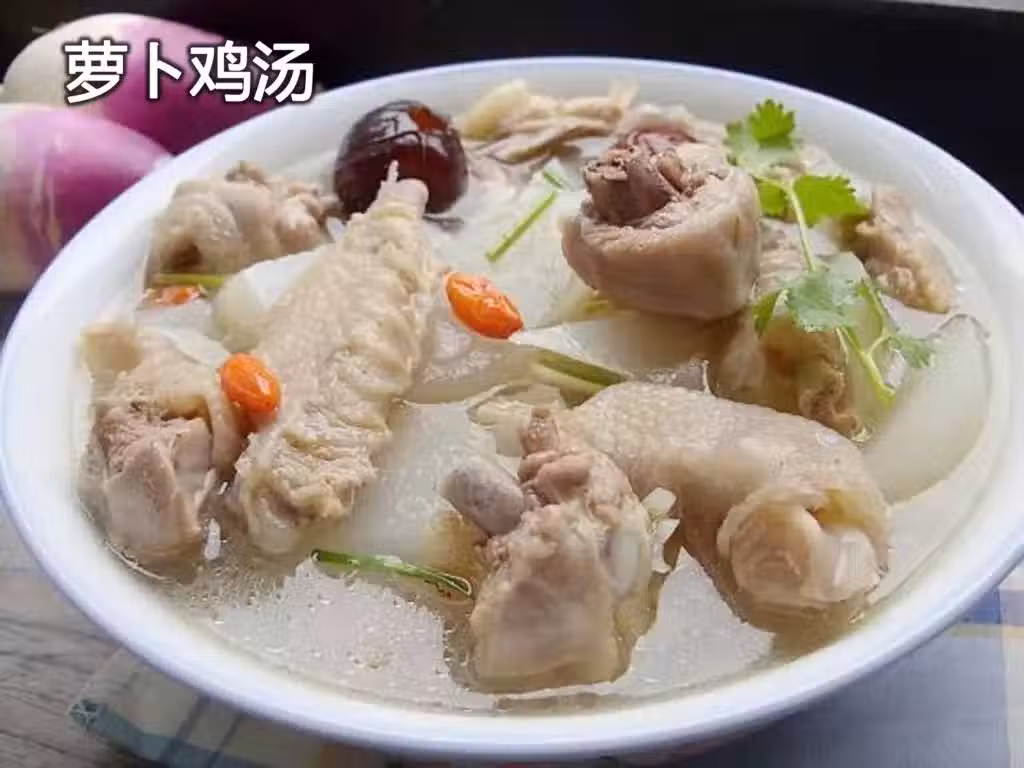 材料:雞 半隻,蘿蔔 2個,蜜棗 4個,枸杞 10個,蔥姜,鹽,香菜,食用油