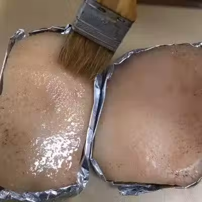 10、在冰箱冷藏中取出腌好的五花包裹上錫紙,用毛刷在豬皮表面刷一層白醋或者抹上小蘇打粉也是可以的。